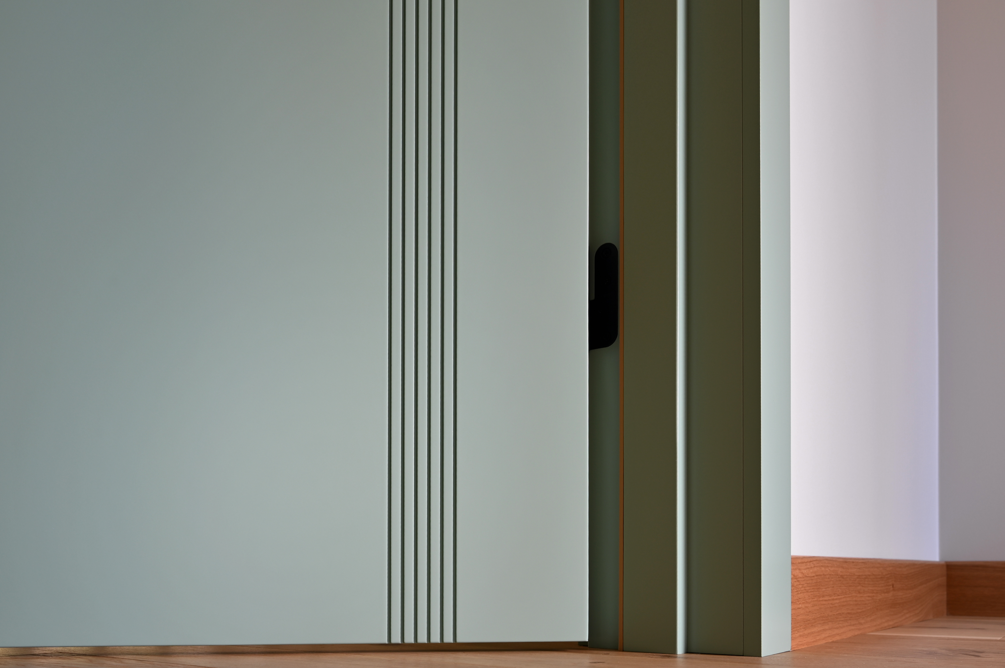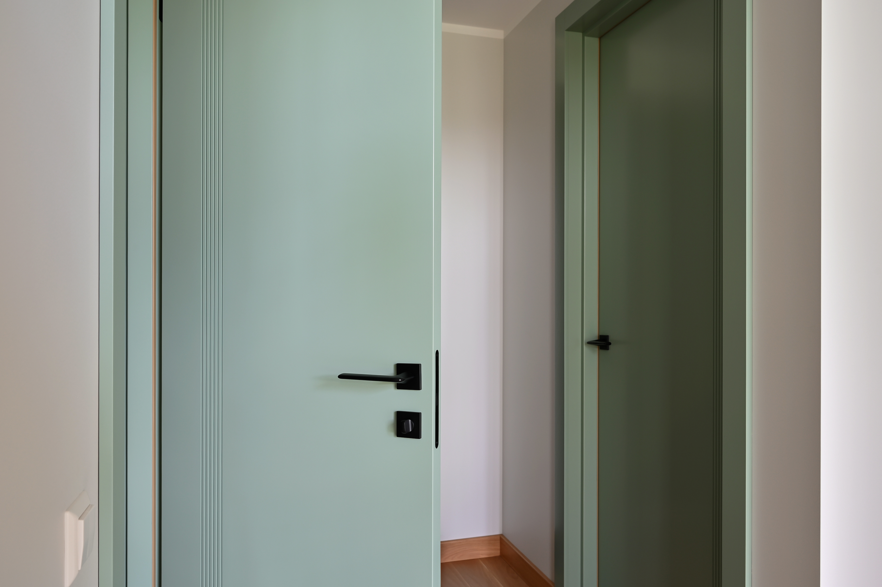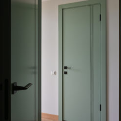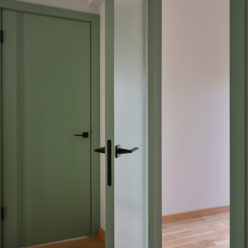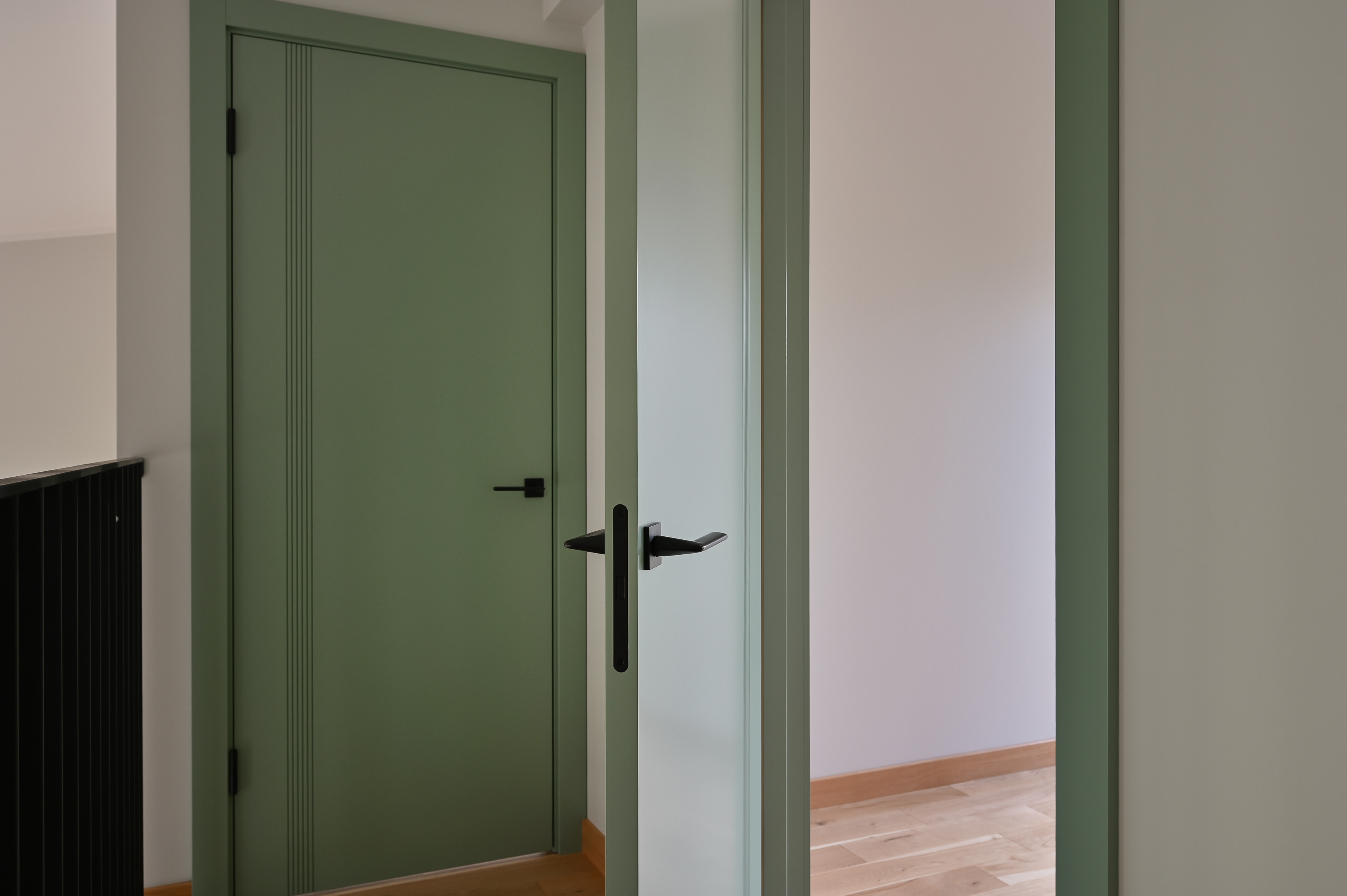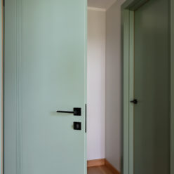 Within the project, 24 door sets were manufactured and installed: smooth, painted doors with vertical grooves, fitted with black hardware.
